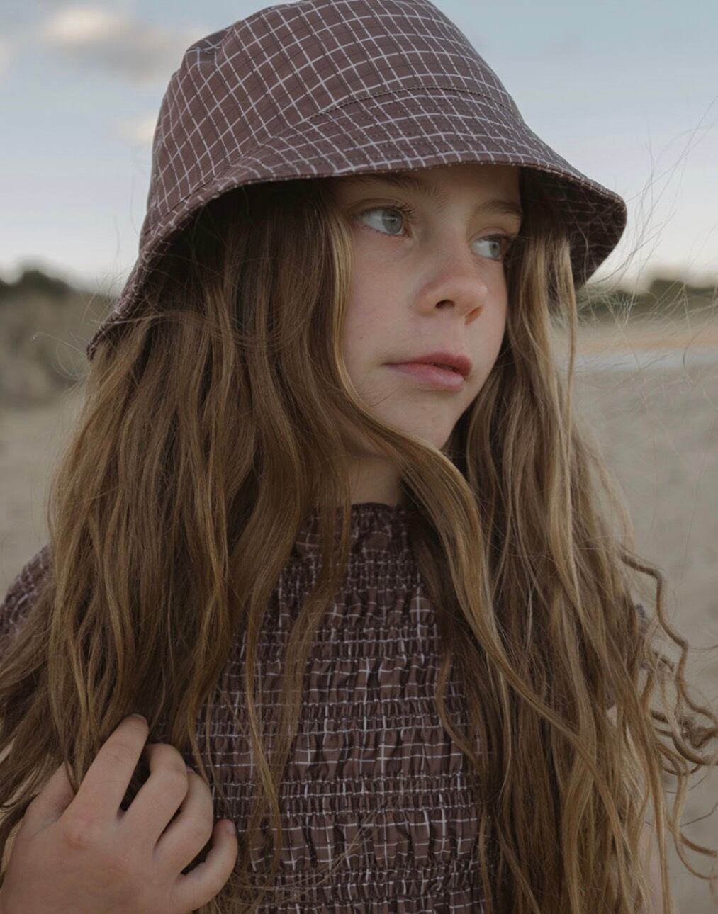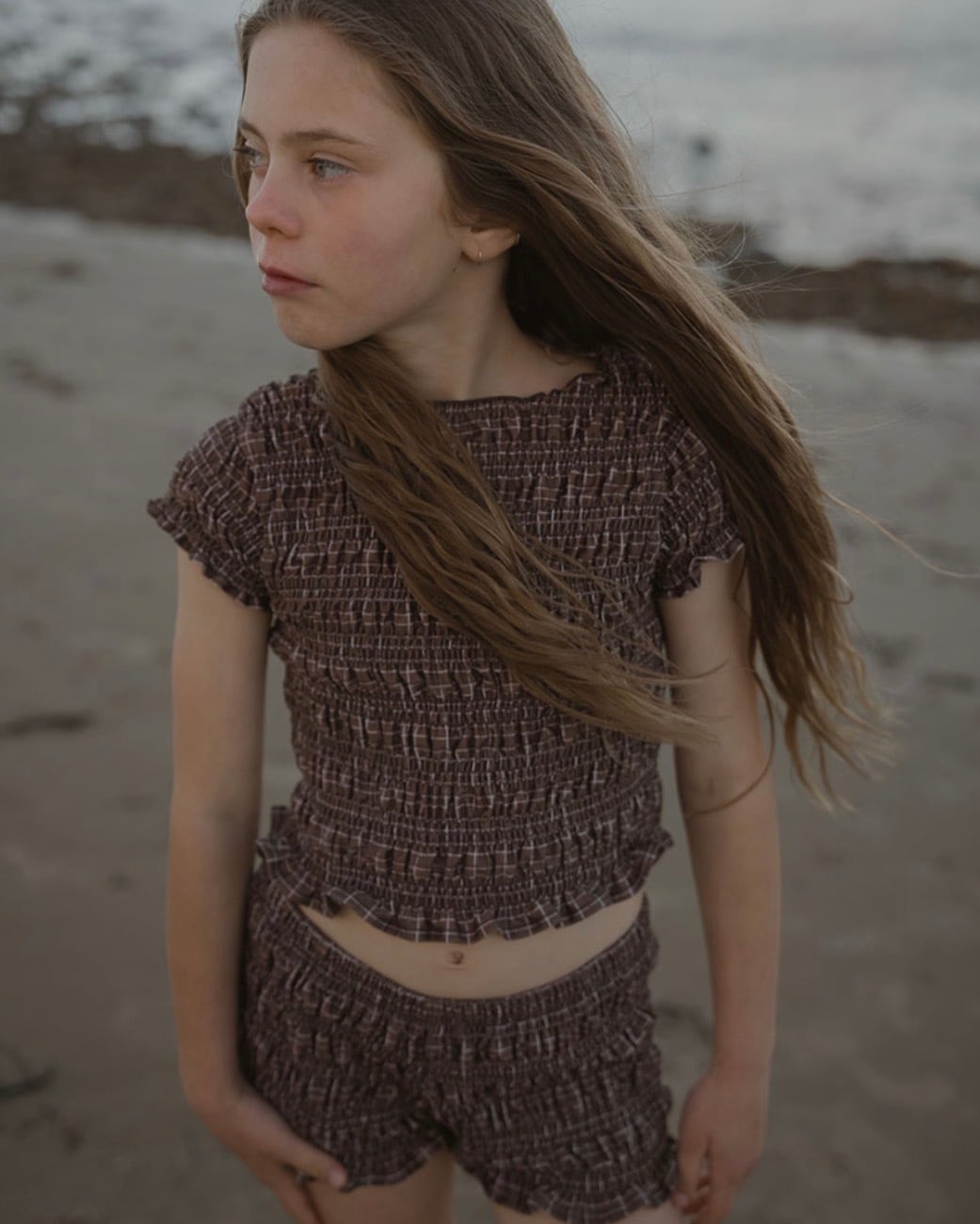 チャーミングなブラウンのグリッドプリントが特徴のこのセットは、小さなお子様がビーチやプールで気ままな一日を過ごすのに最適です。