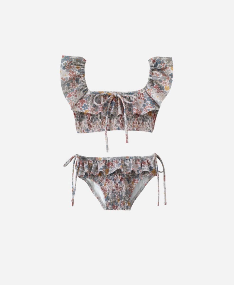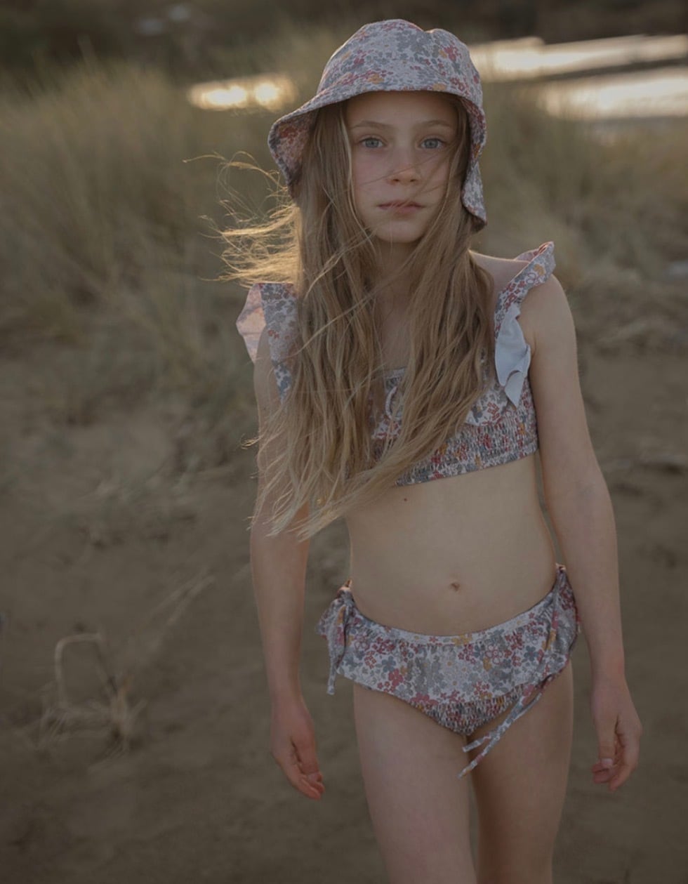 スモックトップは、優しく快適なストレッチ性を備え、ひらひらとしたフリルと繊細なフロントタイが美しいアクセントを添えています。お揃いのボトムスは、水しぶきのたびにくるくると揺れるフリルペプラムが特徴で、調節可能なサイドタイがチャーミングなディテールを添えています。波乗りを楽しんだり、貝殻を集めたり、満開の夏の喜びに浸ったりする暖かい日にぴったりです。