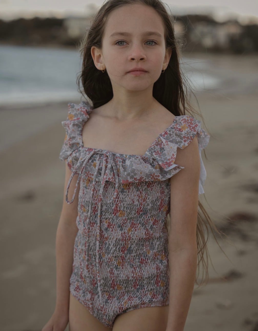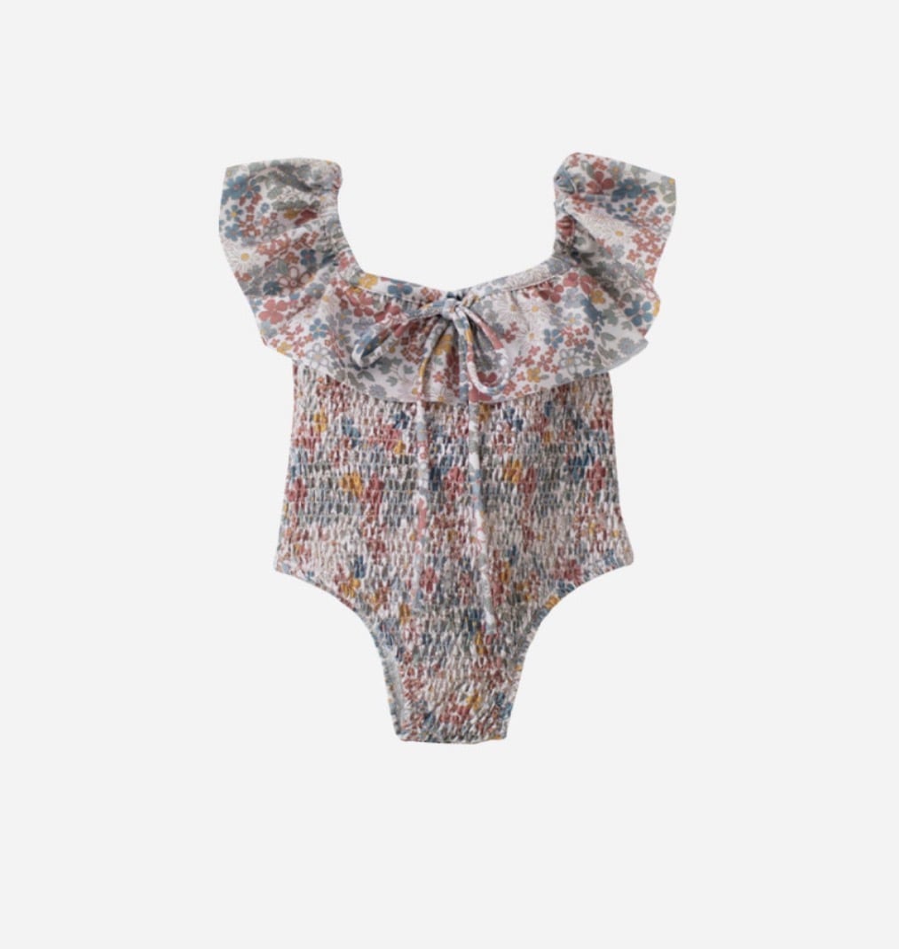 花々に包まれた太陽のような、そんな気分を味わえる水着。柔らかなブルー、温かみのあるイエロー、そして優しいレッドの色合いで、手描きのデイジーや小さな花々が咲き誇る、田園地帯の牧草地の魅力を捉えたフローラルプリント。才能あふれるフランス人職人によって特別に描かれたこの柄は、水しぶき一つ一つに、遊び心とノスタルジックなスピリットを添えています。