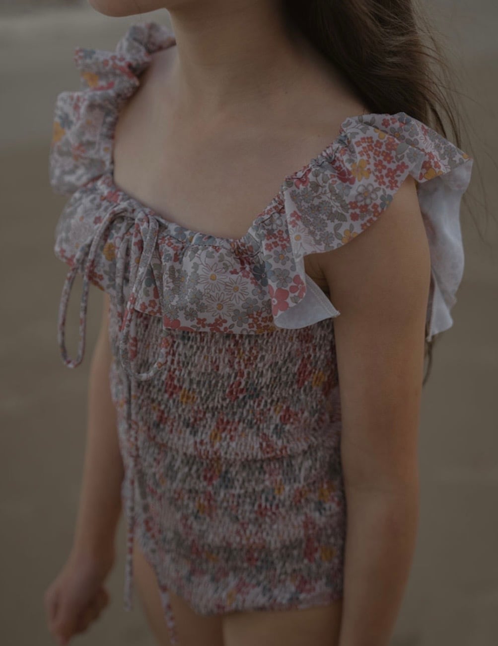 伸縮性のあるスモックボディスが心地よく、包み込むようなフィット感を実現。フリルストラップとフロントのキュートなリボンが、より一層可愛らしさを演出します。笑い声、暖かいそよ風、そしていつまでも甘い夏の日々のために作られた一枚です。
