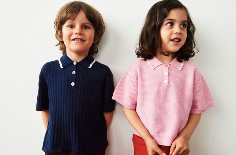 オーガニックコットンを使用した、リブ編みの半袖ポロシャツです。小さめのシャツカラーはニットチェック柄で、コントラストカラーの縁取りが施されています。フロントはパールシェルボタンで開閉し、裾は細めのリブ編みです。ややオーバーサイズのフィット感です。
